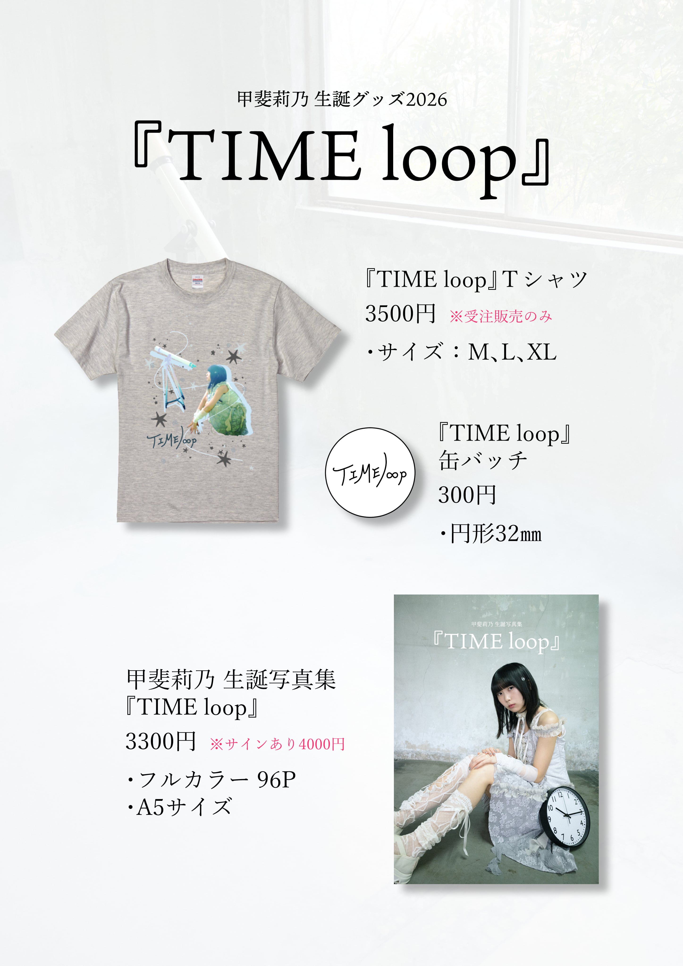 甲斐莉乃の生誕2026の生誕グッズ『TIME loop』Tシャツです。